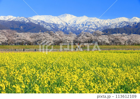 【富山県】あさひ舟川 春の四重奏(満開の桜と菜の花と北アルプス)
