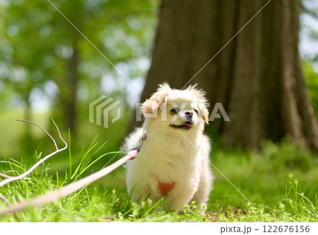 穏やかな日差しの中 公園で飼い主の男性と散歩する笑顔のチワワ