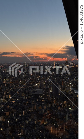 東京スカイツリーから見た夕焼けと遠くに見える東京タワー