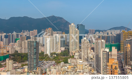 Kowloon City skyline with mountains under clear blue sky March 8 2026