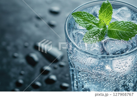 Refreshing citrus drink with ice and mint leaves in clear glass