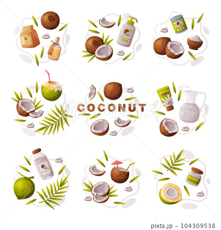 Coconut Products as Tropical Fruit and Organic Food and Cosmetic Ingredient Vector Composition Set