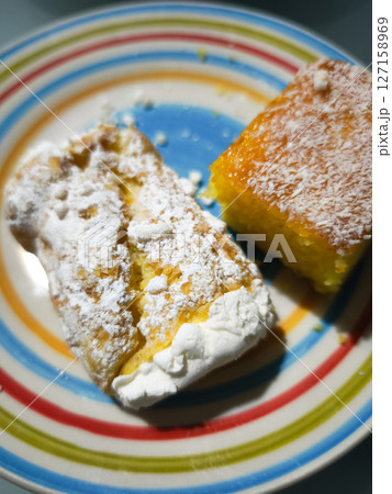Italian pastries sprinkled with powdered sugar and coconut, resting on colorful striped plate, highlighting regional dessert charm