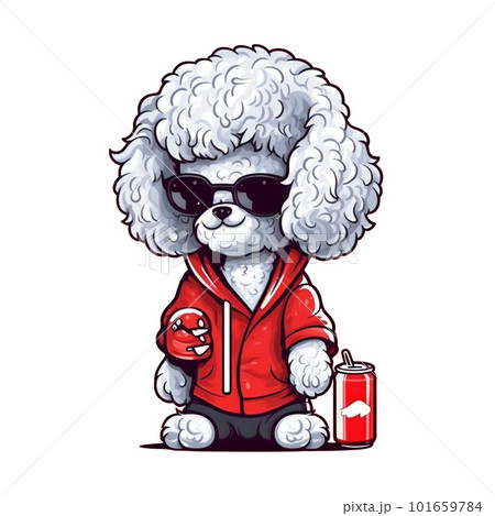 ジュースを飲むジャンバーを着たサングラスのトイプードル