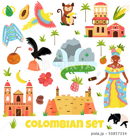 Set of colorful symbols, landmarks of Colombia