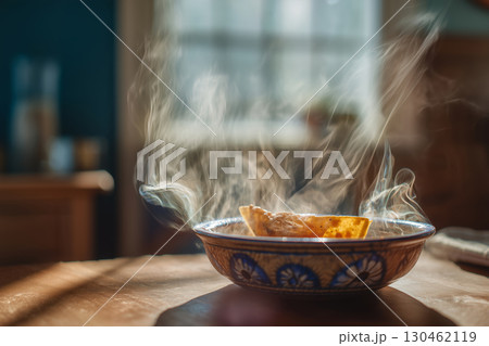 Warm consome bowl with steam rising beside a delicious taco on rustic table