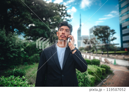 ビジネスマン スマホ 会話 東京駅前 丸の内 オフィス街 真剣なまなざし
