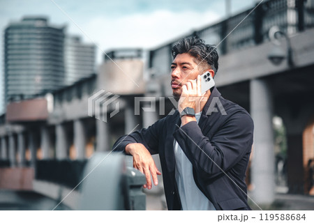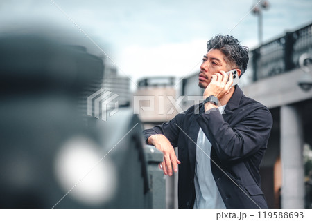 ビジネス街でスマートフォンで話すビジネスマン 212