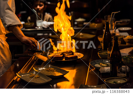 Highly skilled chef dressed in black uniform frying meal with fire in modern kitchen of popular restaurant