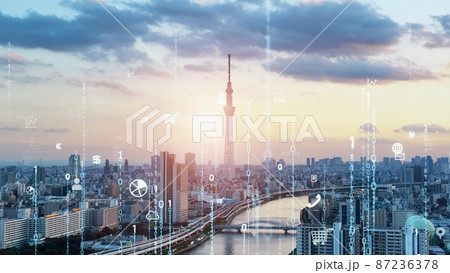 現代的ビルと様々な情報のホログラムパネル アブストラクトイメージ