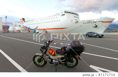 今治港に停戦中のオレンジフェリーと原付バイク