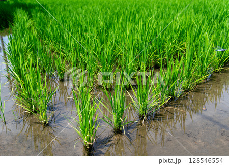 6月の水田 逆光に透ける稲の緑 b 照り返す水面