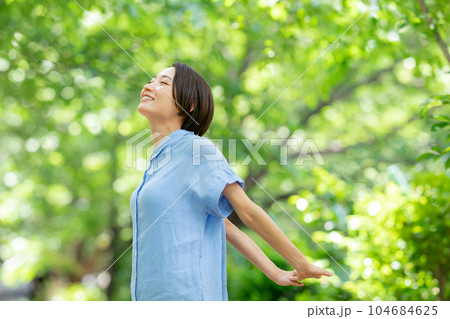 女性 ストレッチ 深呼吸 運動 新緑