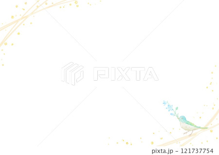 青い小鳥が花をプレゼントする爽やかなフレーム。水彩イラスト。