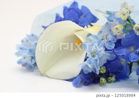 ブルー&ホワイトの花束、洋風和紙の藍色背景