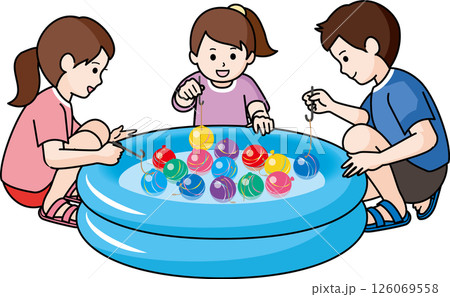 ヨーヨー釣りで遊ぶ男の子と女の子二人