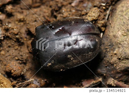 盛夏、雑木林土壌にカブトムシの美しい兜頭部死骸(アウトドアフィールド昆虫マクロ撮影)