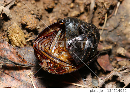 折りたたまれた後ろ翅の構造が見える食いちぎられたカブトムシの上翅甲羅内部(フィールド昆虫マクロ撮影)