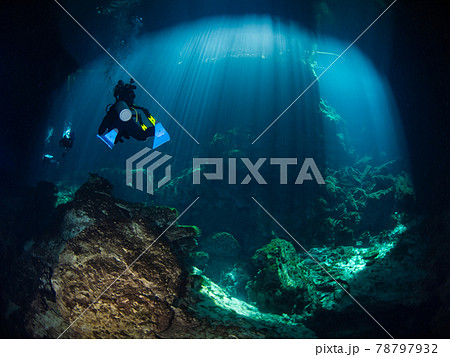 太陽光が射すセノーテを潜るスクーバダイバー達 (プラヤ・デル・カルメン、メキシコ)