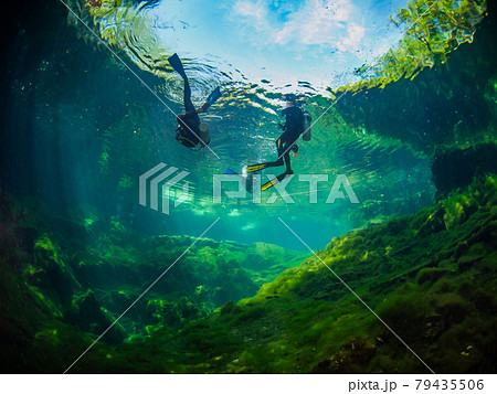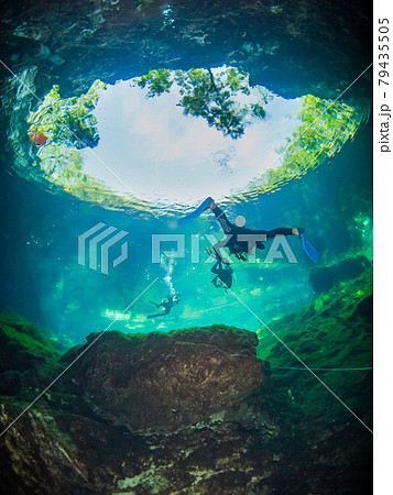 セノーテ(水中洞窟)を出るスクーバダイバー達 (プラヤ・デル・カルメン、メキシコ)