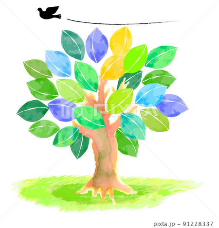 手描きの水彩の大木と平和の鳩のイラスト