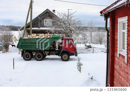 Dump truck with full load of firewood stands in snowy village in winter.