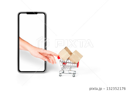 Mini cart and boxes emerging from a smartphone screen. Online retail, add-to-cart and fast delivery concept.