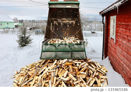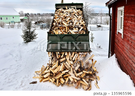 Unloading split logs onto snow in front of rural house in winter time, firewood delivery truck brought logs to village with wood heating.