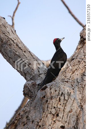 Black woodpeckers in a forest taking advantage of a dead tree in the Netherlands