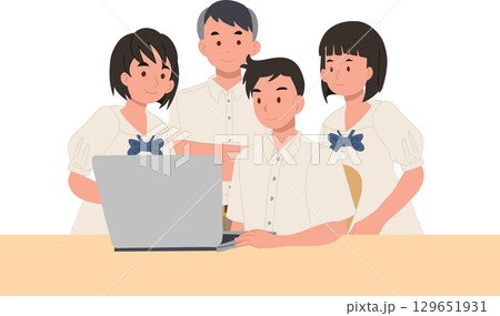 group of male and female students in school uniforms studying on laptop showing technology in education and collaboration