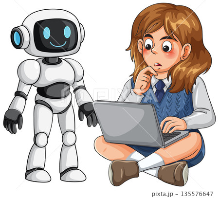 Curious Schoolgirl Learning With Friendly Robot and Laptop