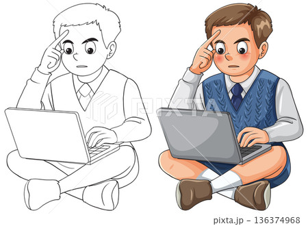 ペンタブを持ってタブレット端末で勉強する男の子のイラスト