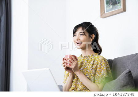 リビングでパソコンとスマホをする女性 スマホ パソコン リビング ライフスタイル