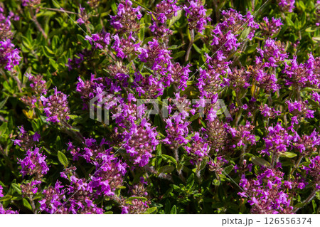 The macrophoto of herb Thymus serpyllum, Breckland thyme. Breckland wild thyme, creeping thyme, or elfin thyme blossoms close up. Natural medicine. Culinary ingredient and fragrant spice in habitat