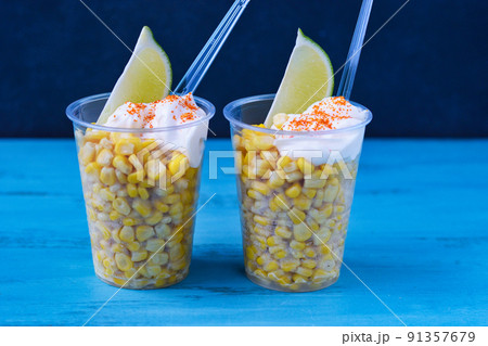 Esquites or Trolley with corn, cheese, mayonnaise and chili. Mexican street food. Close-up