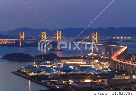 【香川県】夜の青ノ山展望台から見た瀬戸大橋とその町並み(ライトアップされた瀬戸大橋)