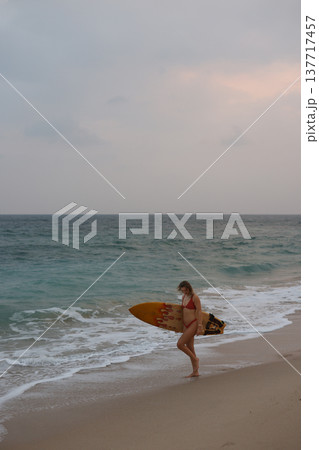 Evening Shoreline With Surfboard. Serene Silhouette Of Female Surfer During Sunset On Quiet Shoreline