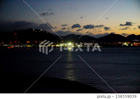 港町の夜景 夕暮れの海 山影のシルエット 橋のライトアップ 水面の反射