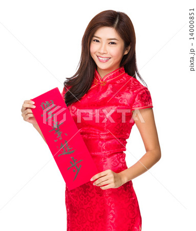 Chinese Woman hold with fai chun, phrase meaning is excel yours