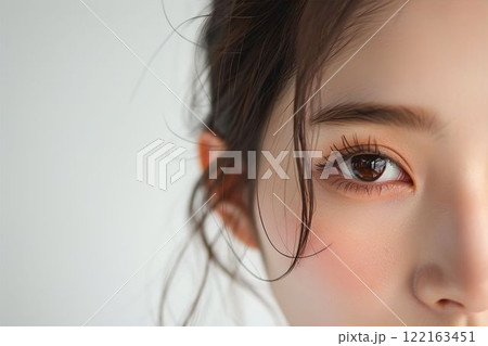 日本人女性の目元のパーツ写真(白背景・美肌・クローズアップ)