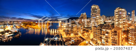 Vancouver, BC, Canada - April 16 2021 : Vancouver marina, False Creek, modern buildings skyline in the background. Granville Bridge.
