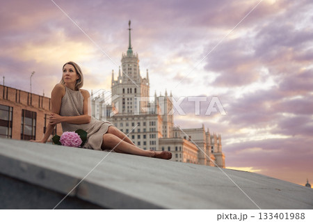 A woman sits on the Tessinsky Bridge with the Kotelnicheskaya Embankment Building rising behind her at sunset