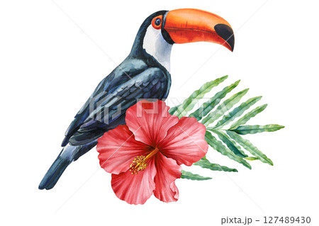 Tropical toucan with red hibiscus and palm leaves watercolor illustration for exotic bird clipart summer jungle decor and wall art