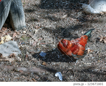Beautiful rooster is standing on the ground.
