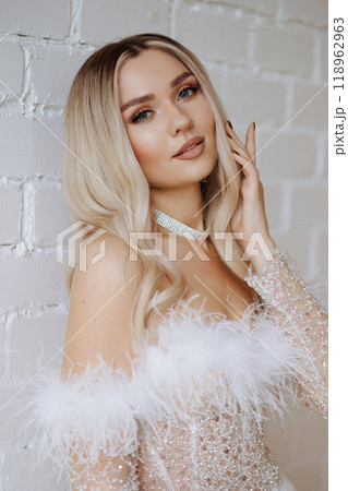 Close-up portrait blonde in a white fluffy wedding dress poses against a white brick wall.