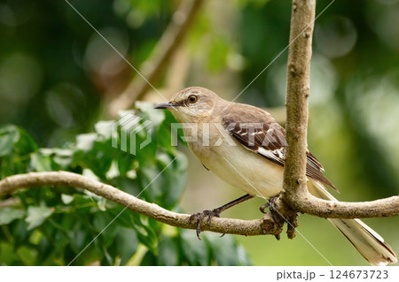 Northern mockingbird is perched on a tree branch in the summer garden.
