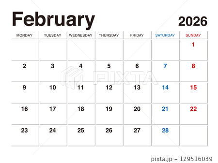 2026年2月のカレンダー 月曜始まり 日本の祝日表記無し
