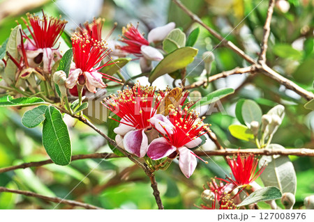 赤と白のフェイジョアの花(春、五月)
