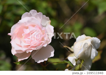 薔薇園に白色のバラの花が咲いています。