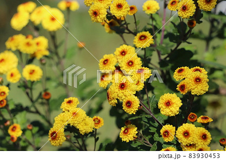 秋の庭に咲く黄色に赤の縁取りのあるスプレー菊の花